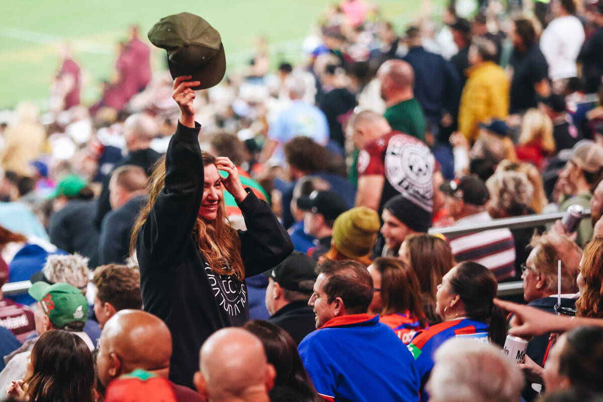 A fan waves her hat during a rugby match between the Sea Eagles and Rabbitohs during the NRL Telstra Premiership season opening game at Allegiant Stadium on Saturday, March 2, 2024, in Las Vegas. (Madeline Carter/Las Vegas Review-Journal) @madelinepcarter