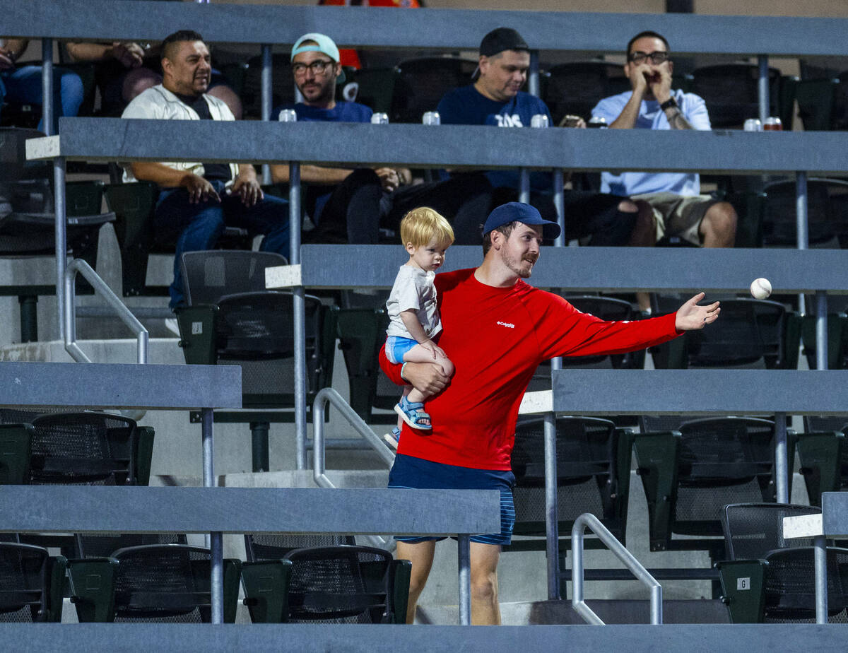 A fan catches a baseball while holding his son as the Aviators battle the El Paso Chihuahuas during their baseball game at the Las Vegas Ballpark on Tuesday, Sept. 17, 2024, in Las Vegas. (L.E. Baskow/Las Vegas Review-Journal) @Left_Eye_Images