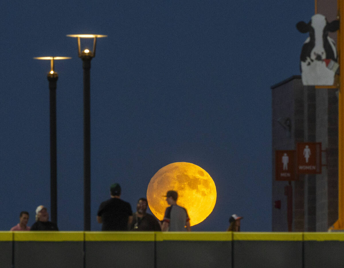 A Harvest Supermoon rises as fans gather on the wall for the Aviators against the El Paso Chihuahuas at the Las Vegas Ballpark on Tuesday, Sept. 17, 2024, in Las Vegas. (L.E. Baskow/Las Vegas Review-Journal) @Left_Eye_Images