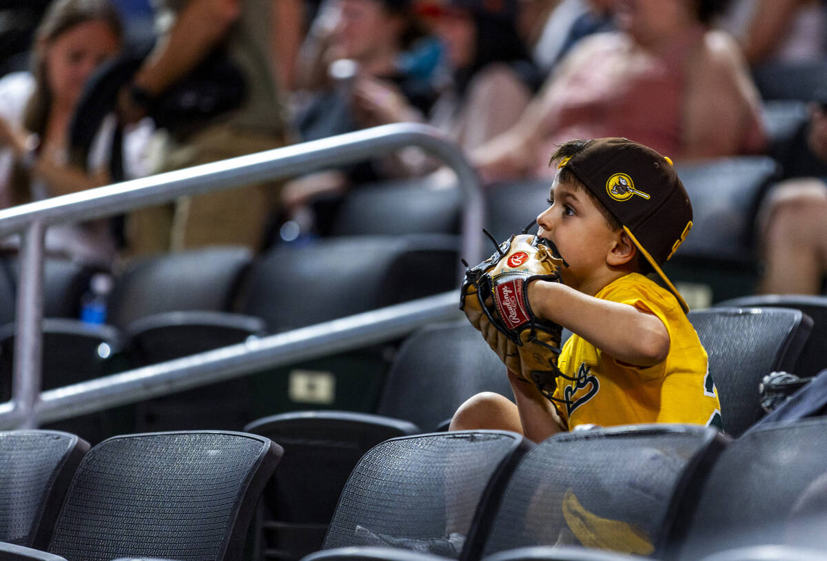 A young fan chews on his glove as the Aviators battle the El Paso Chihuahuas during their baseball game at the Las Vegas Ballpark on Tuesday, Sept. 17, 2024, in Las Vegas. (L.E. Baskow/Las Vegas Review-Journal) @Left_Eye_Images