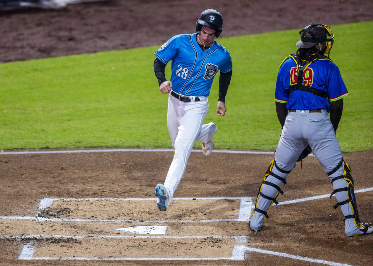 Aviators infielder Armando Alvarez (28) scores past El Paso Chihuahuas catcher Luis Campusano (49) during their baseball game at the Las Vegas Ballpark on Tuesday, Sept. 17, 2024, in Las Vegas. (L.E. Baskow/Las Vegas Review-Journal) @Left_Eye_Images