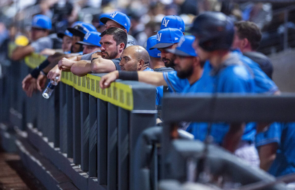 Aviators players watch the action for the dugout as they battle the El Paso Chihuahuas during their baseball game at the Las Vegas Ballpark on Tuesday, Sept. 17, 2024, in Las Vegas. (L.E. Baskow/Las Vegas Review-Journal) @Left_Eye_Images
