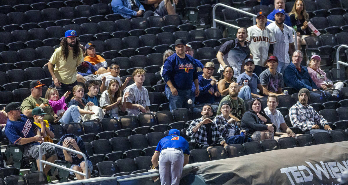 Fans react as a foul ball ends up in the stands as the El Paso Chihuahuas infielder Matthew Batten (2) is unable to catch it against the Aviators during their baseball game at the Las Vegas Ballpark on Tuesday, Sept. 17, 2024, in Las Vegas. (L.E. Baskow/Las Vegas Review-Journal) @Left_Eye_Images