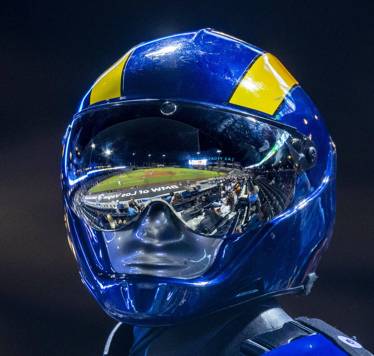 The Aviator has the game reflected in his helmet as they battle the El Paso Chihuahuas during their baseball game at the Las Vegas Ballpark on Tuesday, Sept. 17, 2024, in Las Vegas. (L.E. Baskow/Las Vegas Review-Journal) @Left_Eye_Images