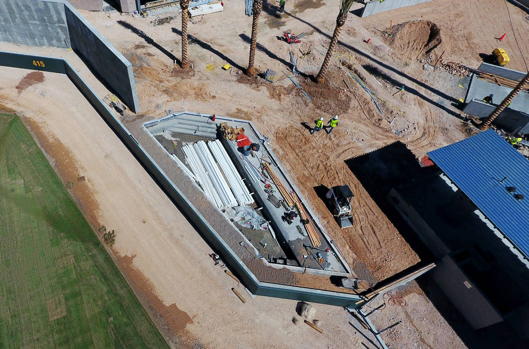 Aerial view of the Las Vegas Ballpark as the outfield swimming pool construction nears completion on Thursday March 14, 2019. (Michael Quine/Las Vegas Review-Journal) @Vegas88s