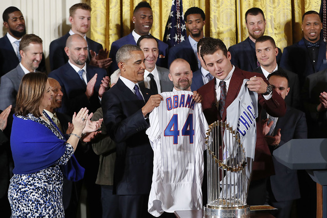 The Cubs gave Obama two baseball jerseys — home and away — with the number 44, among other gifts. Cubs first baseman Anthony Rizzo also wears the number, and Obama referred to Rizzo as “my fellow 44.” Obama is the nation’s 44th president.