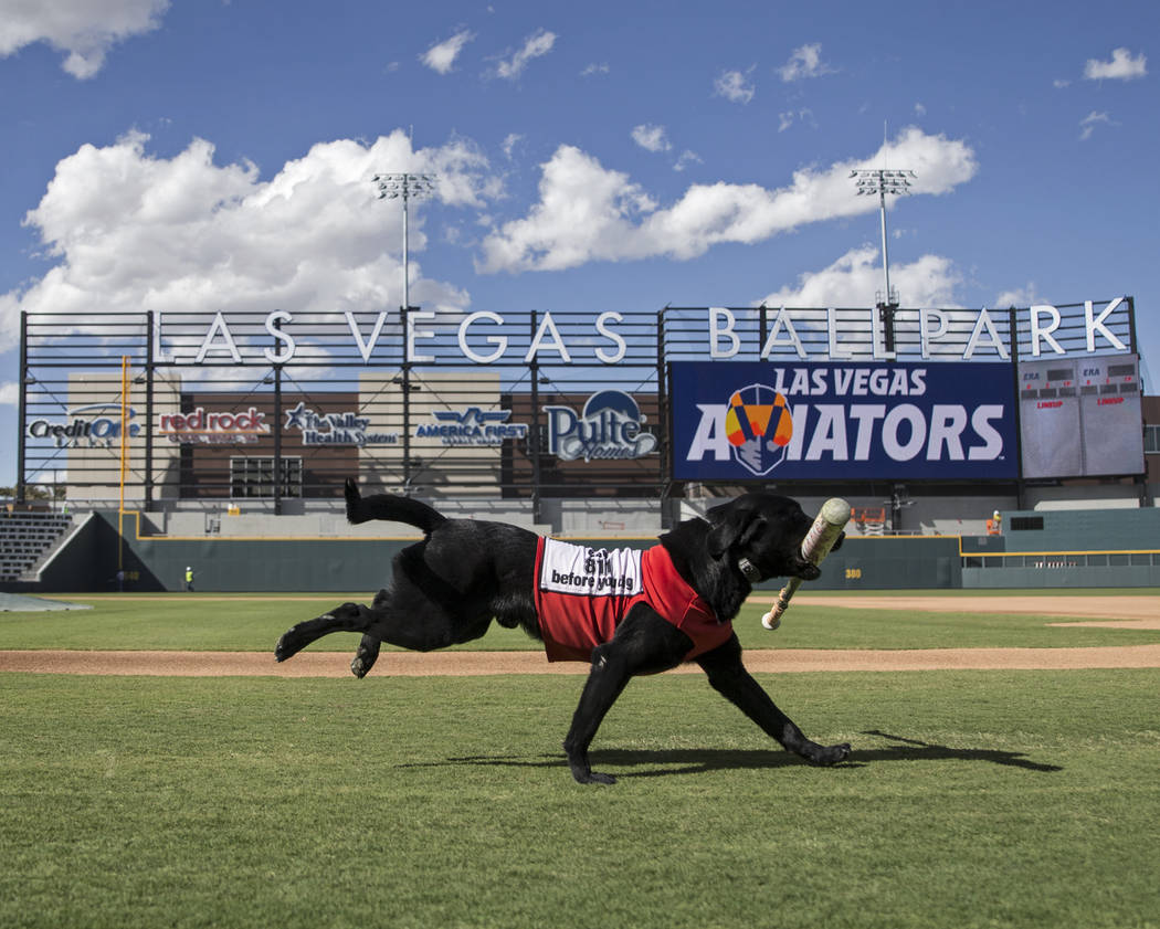 Finn, a 5-year-old black lab, retrieves a bat at Aviators media day at Las Vegas Ballpark on Tuesday, April 2, 2019, in Las Vegas. (Benjamin Hager Review-Journal) @BenjaminHphoto