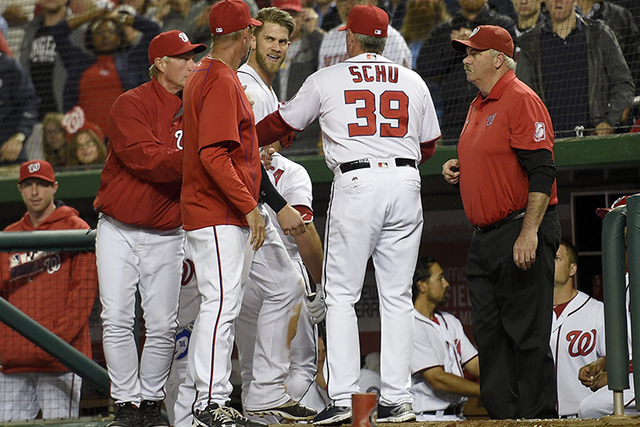 Major League Baseball says it is reviewing Washington Nationals slugger Bryce Harper’s confrontation with an umpire to decide whether he should be disciplined.