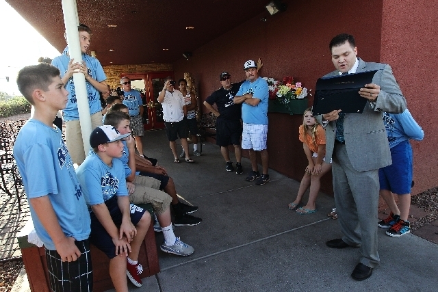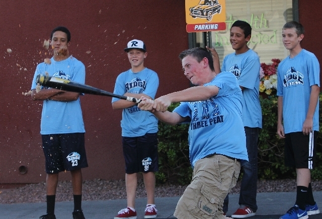 It’s like a dream come true. The Little League team from Mountain Ridge was honored Wednesday at a local Buca di Beppo restaurant and given the opportunity to smash some giant meatballs with their baseball bats. Mountain Ridge advanced to the semifinals of the Little League Baseball West Regional in San Bernardino, Calif., where it lost to Eastlake of Chula Vista, Calif. The boys were also presents a certificate of achievement by Michael Klein, a representative of the office of U.S. Sen. Harry Reid, D-Nev.