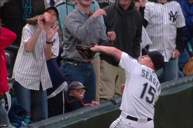 Forget about a game-saving catch. Mariners third baseman Kyle Seager made a potential baby-saving catch in Monday’s loss to the New York Yankees in Seattle.