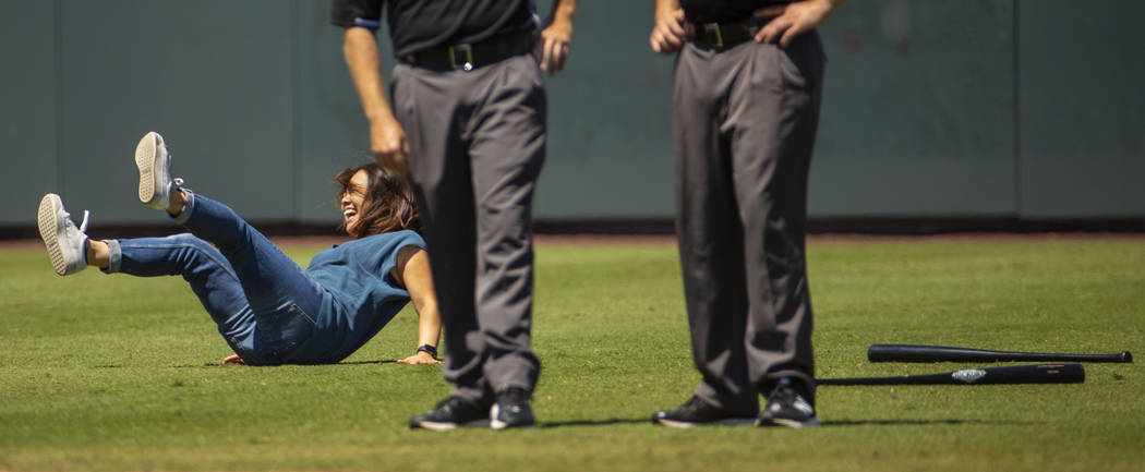 An Aviators fan falls down during a dizzy bat race with her daughter during a break in the action versus the Tacoma Rainiers at the Las Vegas Ballpark on Sunday, May 12, 2019 in Las Vegas. (L.E. Baskow/Las Vegas Review-Journal) @Left_Eye_Images