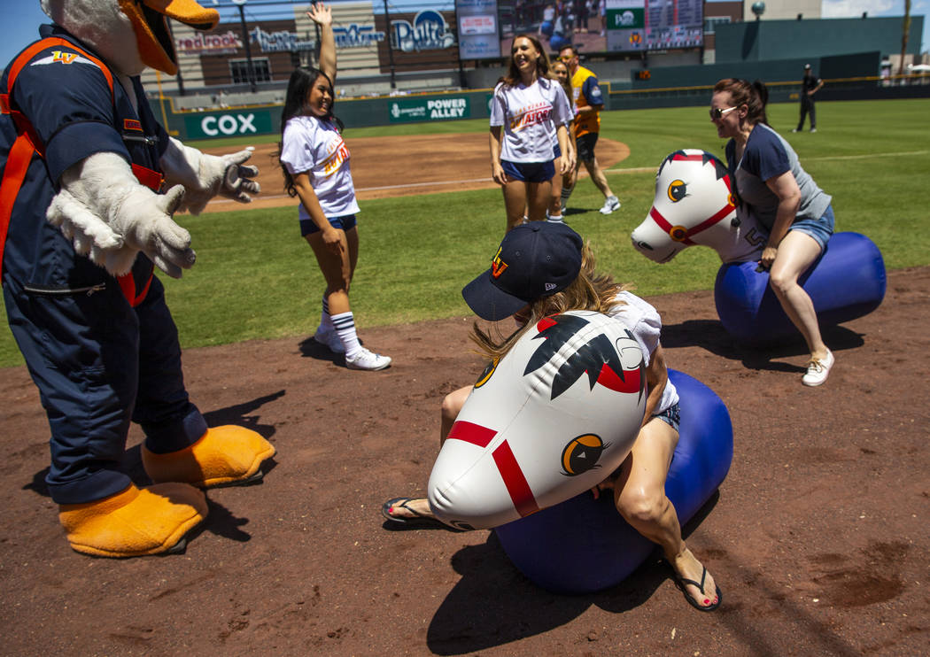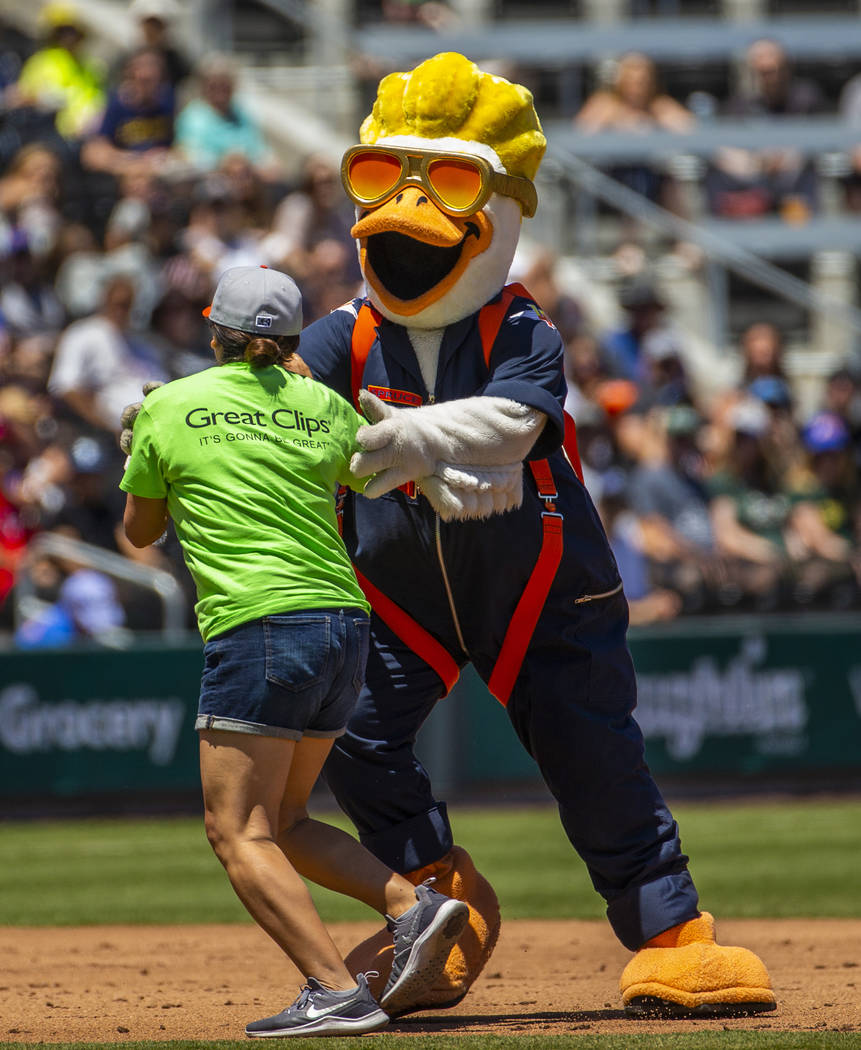 Puddles the Duck attempts to slow down Erica Haskin as they race around the bases while the Aviators face the Tacoma Rainiers at the Las Vegas Ballpark on Sunday, May 12, 2019 in Las Vegas. (L.E. Baskow/Las Vegas Review-Journal) @Left_Eye_Images