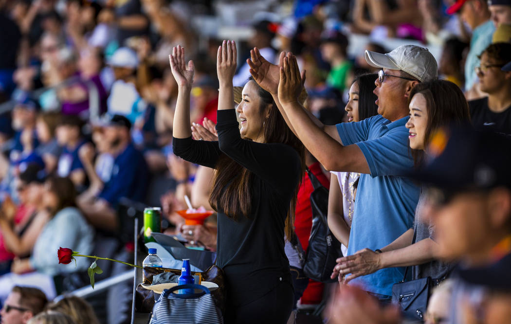 Aviators fans Stacy Chen, Kylie Huang, 11, with Kevin and Gloria Lin celebrate another run late in the game versus the Tacoma Rainiers at the Las Vegas Ballpark on Sunday, May 12, 2019 in Las Vegas. (L.E. Baskow/Las Vegas Review-Journal) @Left_Eye_Images