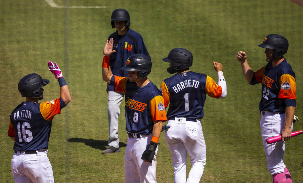 Aviators players celebrate a grand slam late in the game versus the Tacoma Rainiers at the Las Vegas Ballpark on Sunday, May 12, 2019 in Las Vegas. (L.E. Baskow/Las Vegas Review-Journal) @Left_Eye_Images