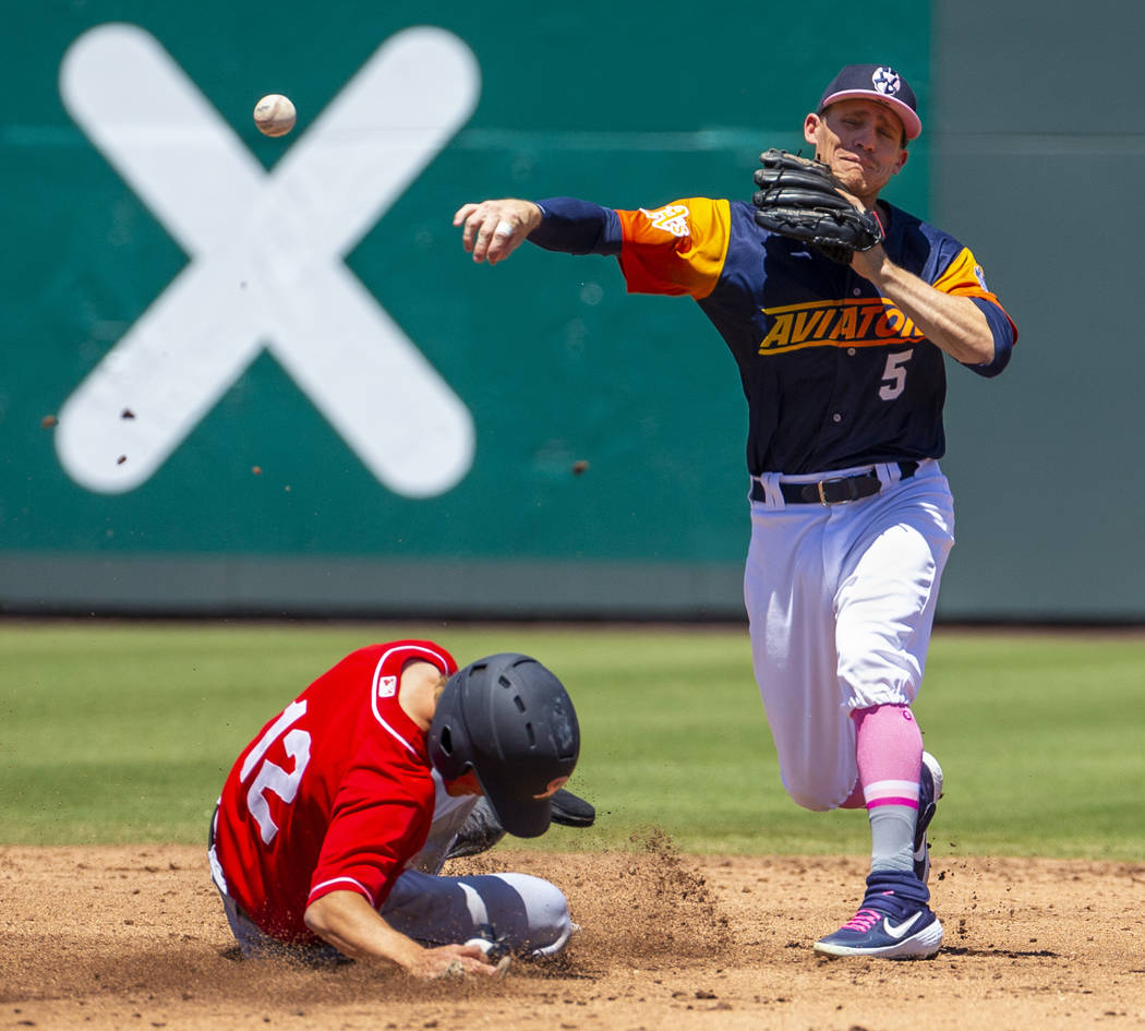 Tacoma Rainiers runner Connor Kopach (12) slides into second base late as Aviators second baseman Corban Joseph (5) makes the tag and throw to first base at the Las Vegas Ballpark on Sunday, May 12, 2019 in Las Vegas. (L.E. Baskow/Las Vegas Review-Journal) @Left_Eye_Images