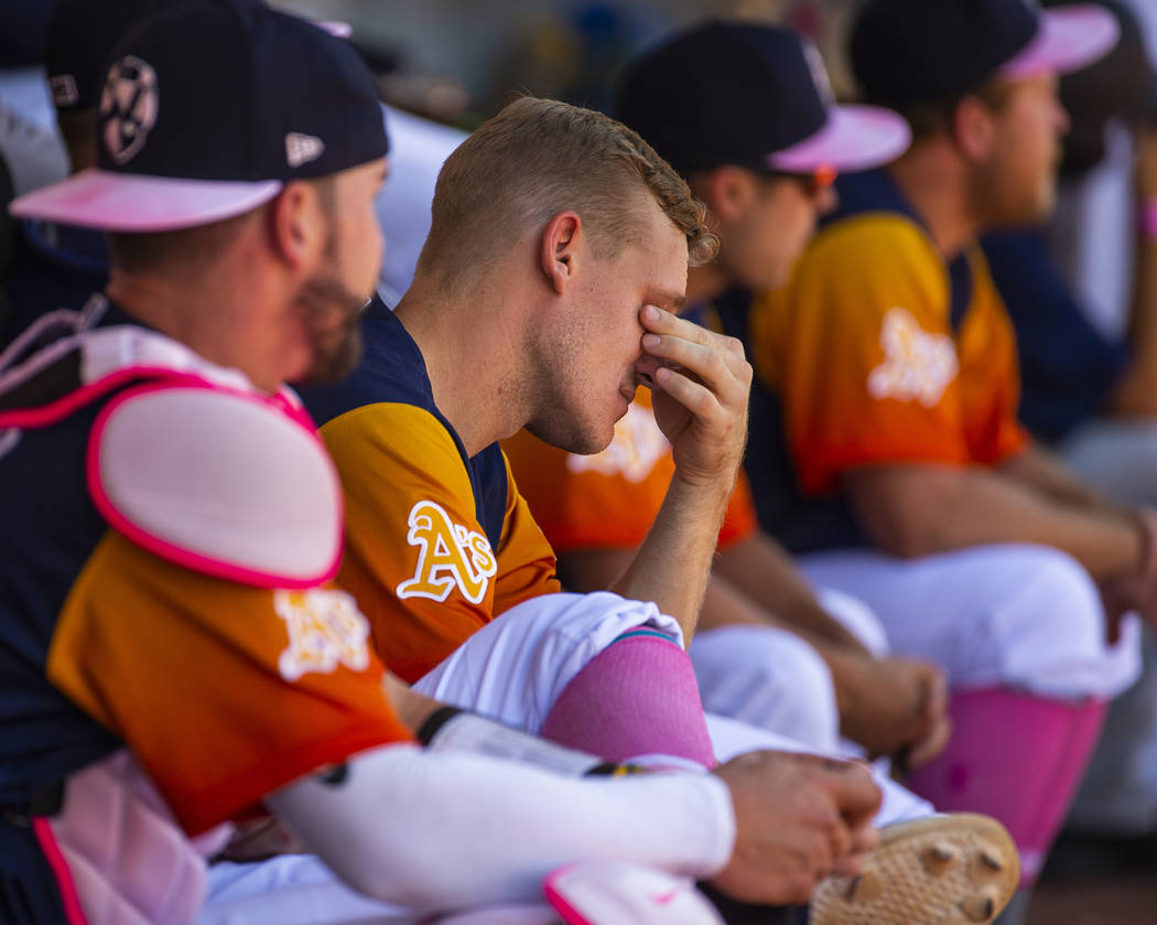 The Aviators Corban Joseph (5) is feeling the strain of a possible loss while in the dugout during a game versus the Tacoma Rainiers at the Las Vegas Ballpark on Sunday, May 12, 2019 in Las Vegas. (L.E. Baskow/Las Vegas Review-Journal) @Left_Eye_Images