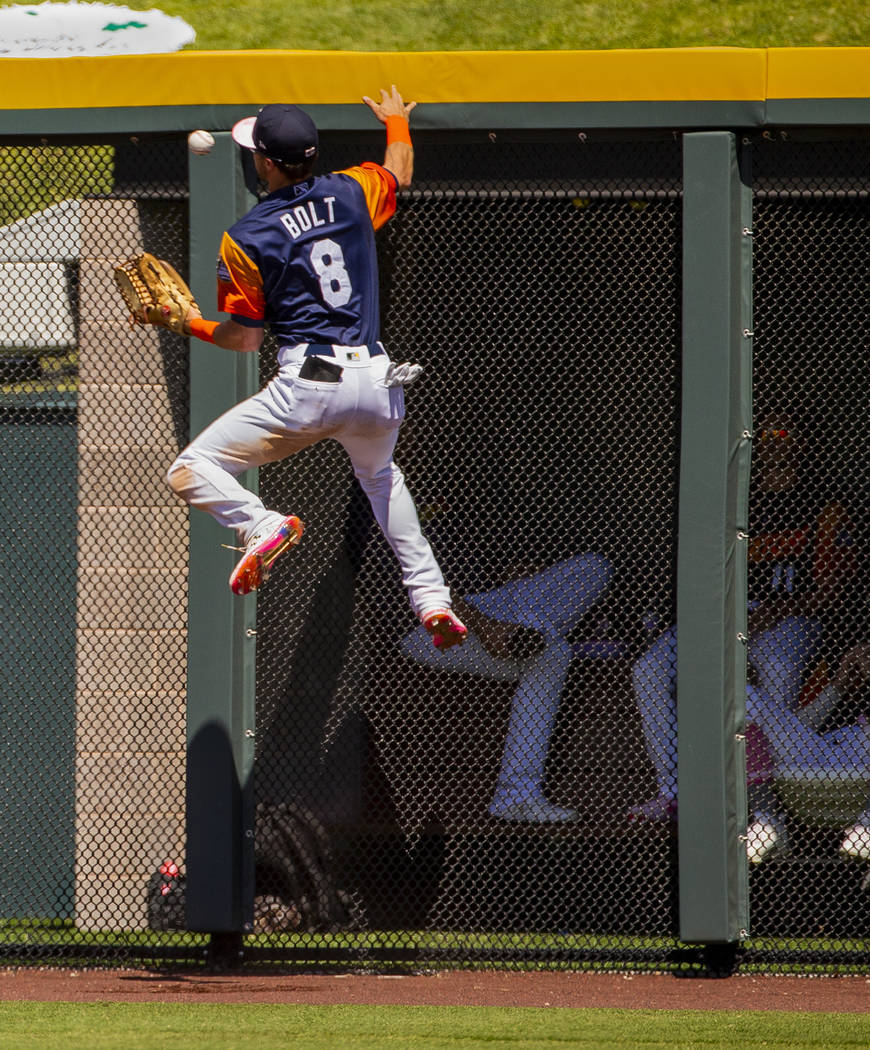 The Aviators Skye Bolt (8) attempts to catch a ball deep in right field hit off the wall by the Tacoma Rainiers at the Las Vegas Ballpark on Sunday, May 12, 2019 in Las Vegas. (L.E. Baskow/Las Vegas Review-Journal) @Left_Eye_Images