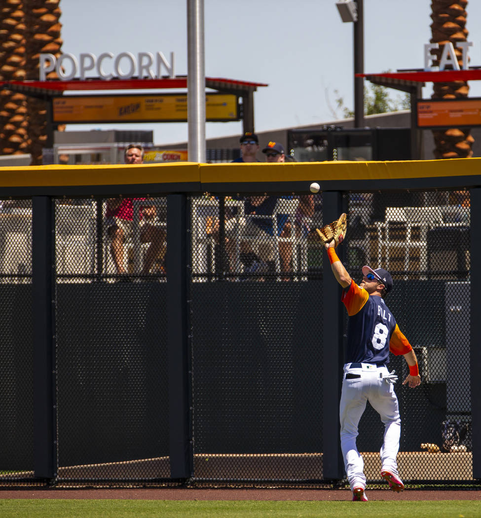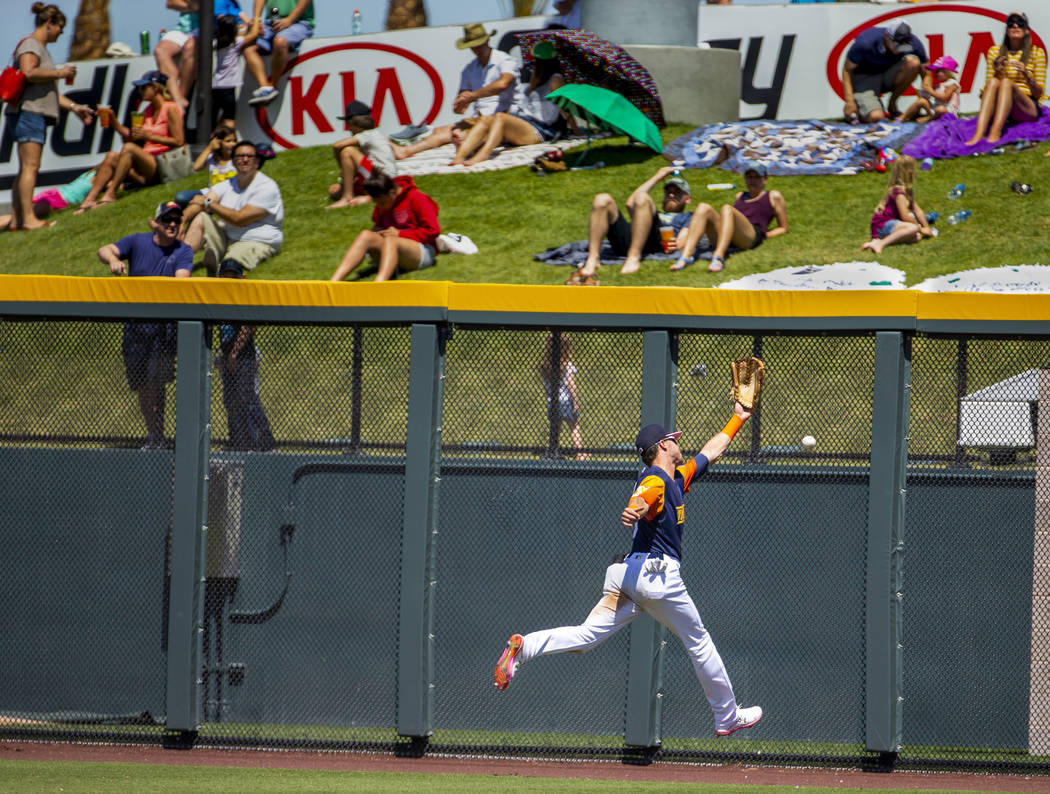 The Aviators Skye Bolt (8) misses a deep fly ball in right field hit off the wall by the Tacoma Rainiers at the Las Vegas Ballpark on Sunday, May 12, 2019 in Las Vegas. (L.E. Baskow/Las Vegas Review-Journal) @Left_Eye_Images