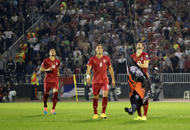 BELGRADE, Serbia — A small drone dangling an Albanian banner and circling the soccer field touched off fighting between Serbian and Albanian players and fans Tuesday, forcing a European Championship qualifier to be called off.