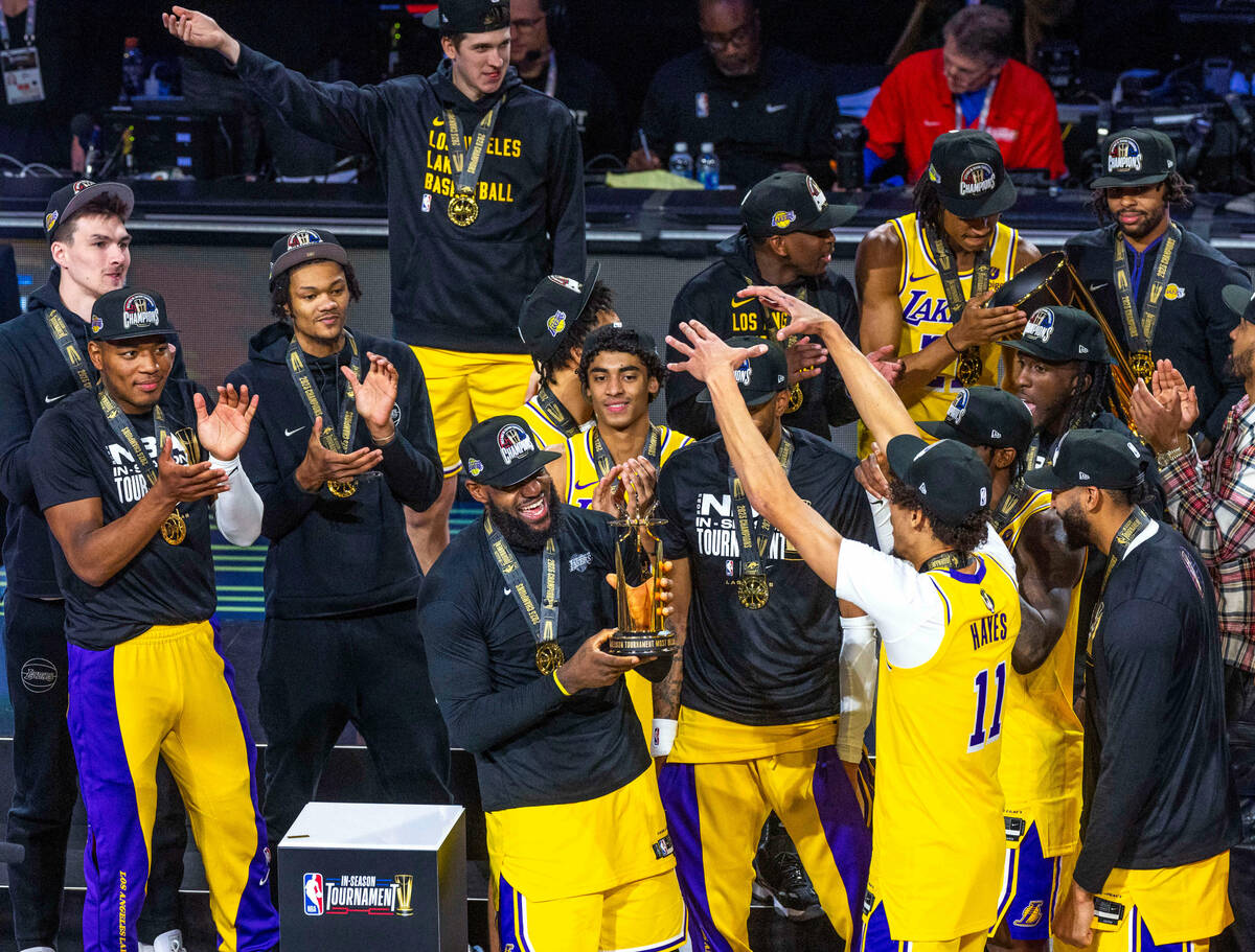 Los Angeles Lakers forward LeBron James (23) holds up the winning trophy about teammates after defeating the Indiana Pacers following the second half of their NBA in-season tournament championship game at T-Mobile Arena on Saturday, Dec. 9, 2023, in Las Vegas. (L.E. Baskow/Las Vegas Review-Journal) @Left_Eye_Images