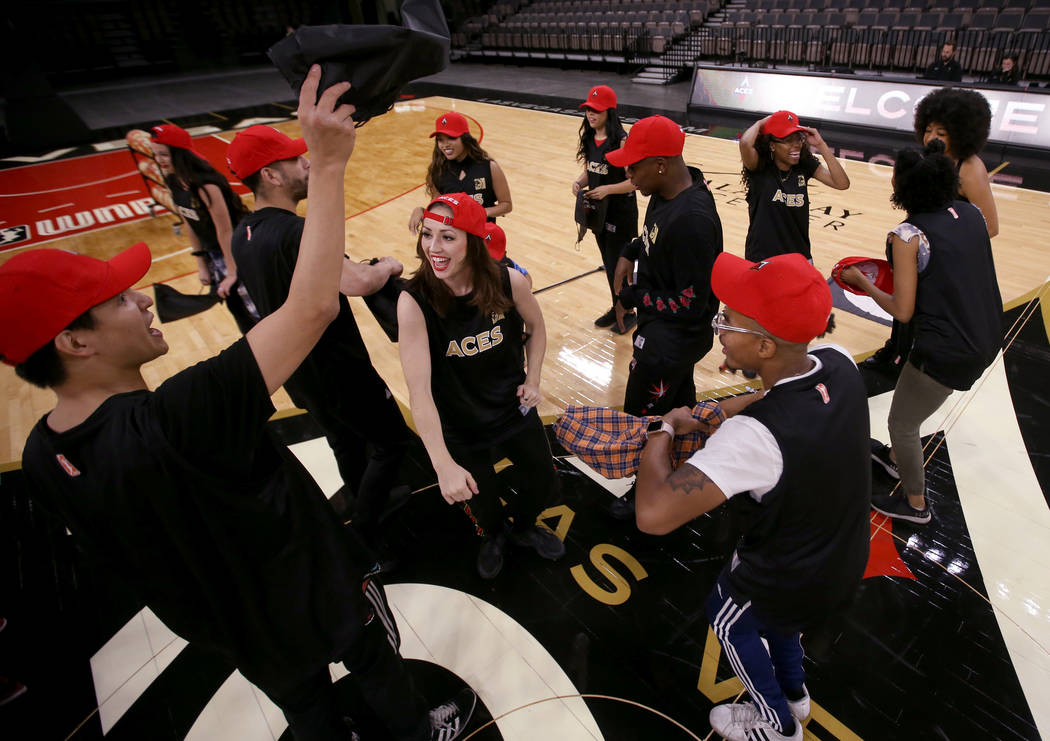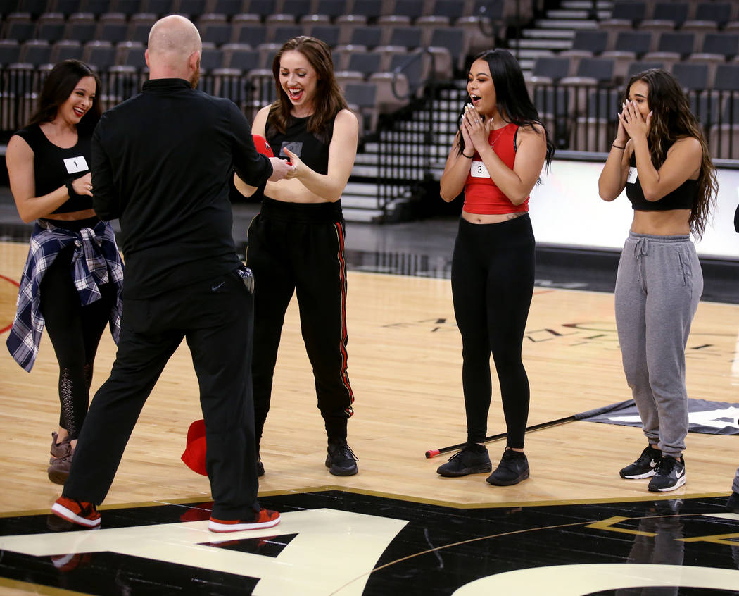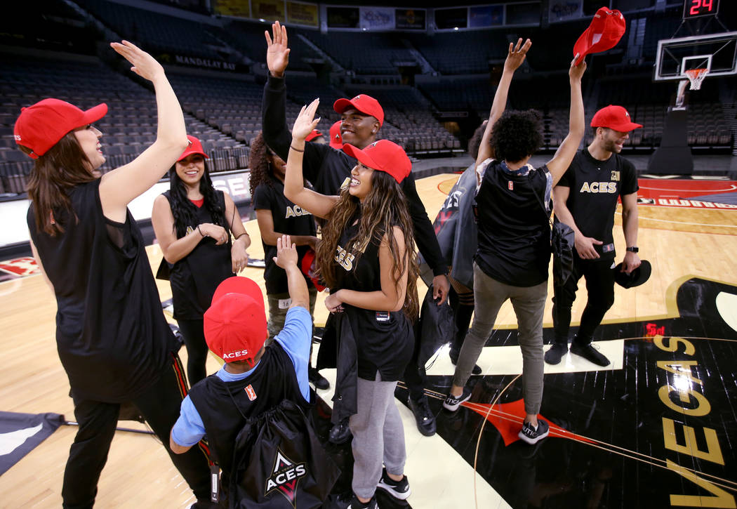 Members of the WNBA Las Vegas Aces Wild Card Crew, from left, Ciera Evans, 19, of Henderson, Skylar Schultz 23, of Henderson, Vanessa Acosta, 18, of Las Vegas, and Yanique Olis, 18, of Las Vegas, receive hats from Blake Broaddus after finding out that they made the team during auditions at Mandalay Bay Events Center Tuesday, April 30, 2019. The Wild Card Crew gets fans fired up during games and community events. (K.M. Cannon/Las Vegas Review-Journal) @KMCannonPhoto