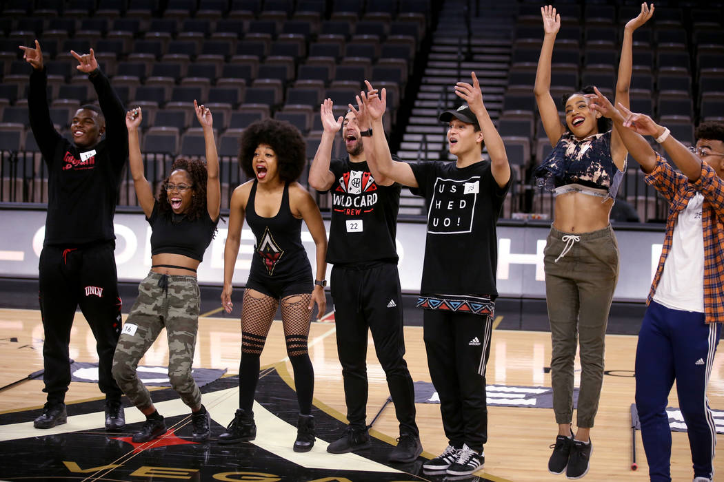 Members of the WNBA Las Vegas Aces Wild Card Crew, from left, Jordan Cline, 34, of Las Vegas, Jeremiah Williams, 19, of Las Vegas, Adam Moss, 28, of Las Vegas,, Tikisha Nelson, 25, of Las Vegas, and Matt Guerrero, 35, of Las Vegas, celebrate after finding out they made the team during auditions at Mandalay Bay Events Center Tuesday, April 30, 2019. The Wild Card Crew gets fans fired up during games and community events. (K.M. Cannon/Las Vegas Review-Journal) @KMCannonPhoto