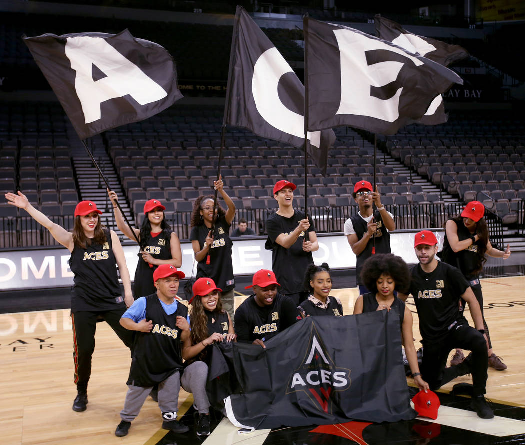 Members of the WNBA Las Vegas Aces Wild Card Crew, pose for a team photo after finding out they made the team during auditions at Mandalay Bay Events Center Tuesday, April 30, 2019. The Wild Card Crew gets fans fired up during games and community events. (K.M. Cannon/Las Vegas Review-Journal) @KMCannonPhoto