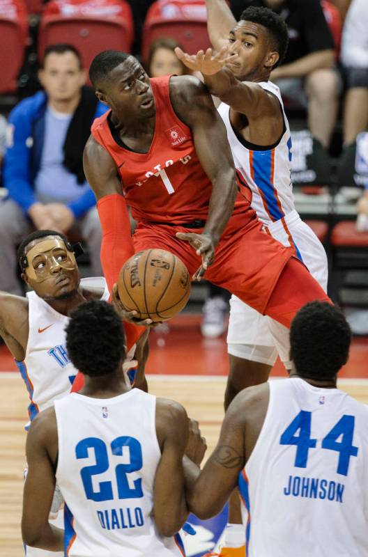 Toronto Raptors guard Rawle Alkins (1) drives past Oklahoma City Thunder defenders Hamidou Diallo (22) and Dakari Johnson (44) in the fourth quarter during the NBA Summer League on Monday, July 9, 2018, at the Thomas & Mack Center, in Las Vegas. Benjamin Hager Las Vegas Review-Journal @benjaminhphoto