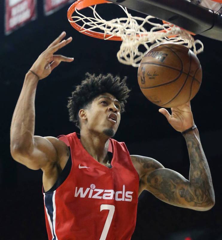 Washington Wizards’ forward Devin Robinson (7) dunks against the San Antonio Spurs during an NBA Summer League basketball game at the Thomas and Mack Center on Sunday, July 8, 2018, in Las Vegas. Bizuayehu Tesfaye/Las Vegas Review-Journal @bizutesfaye