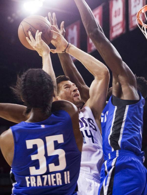 Phoenix Suns forward Alec Peters (14) drives past Orlando Magic guard Melvin Frazier Jr. (35) and center Mohamed Bamba (5) in the third quarter during the NBA Summer League on Monday, July 9, 2018, at the Thomas & Mack Center, in Las Vegas. Benjamin Hager Las Vegas Review-Journal @benjaminhphoto