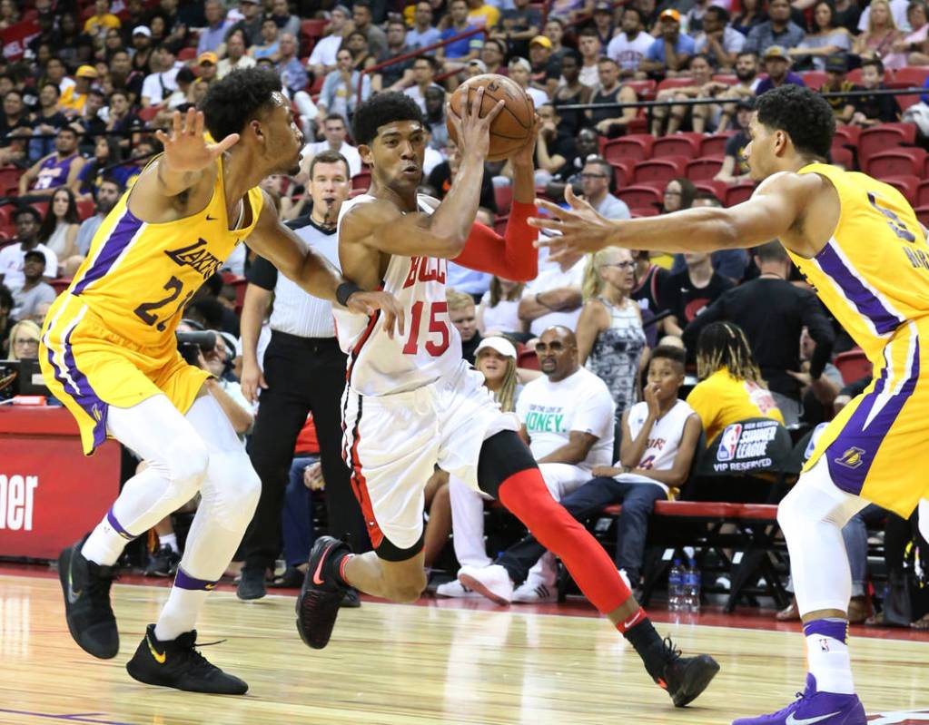 The Los Angeles Lakers guard Josh Hart, right, and forward Jonathan Williams (21) try to defend the Chicago Bulls guard Chandler Hutchinson (15) during an NBA Summer League basketball game at the Thomas and Mack Center on Sunday, July 8, 2018, in Las Vegas. Bizuayehu Tesfaye/Las Vegas Review-Journal @bizutesfaye