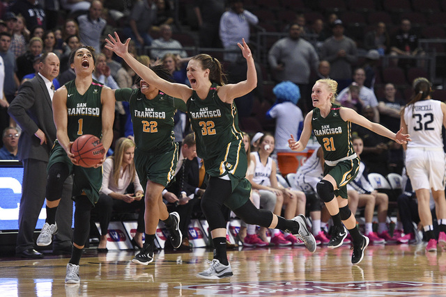 March 8, 2016; Las Vegas, NV, USA; San Francisco Dons players celebrate against the BYU Cougars after the game in the finals of the women’s West Coast Conference tournament at Orleans Arena. (Kyle Terada/USA Today Sports)