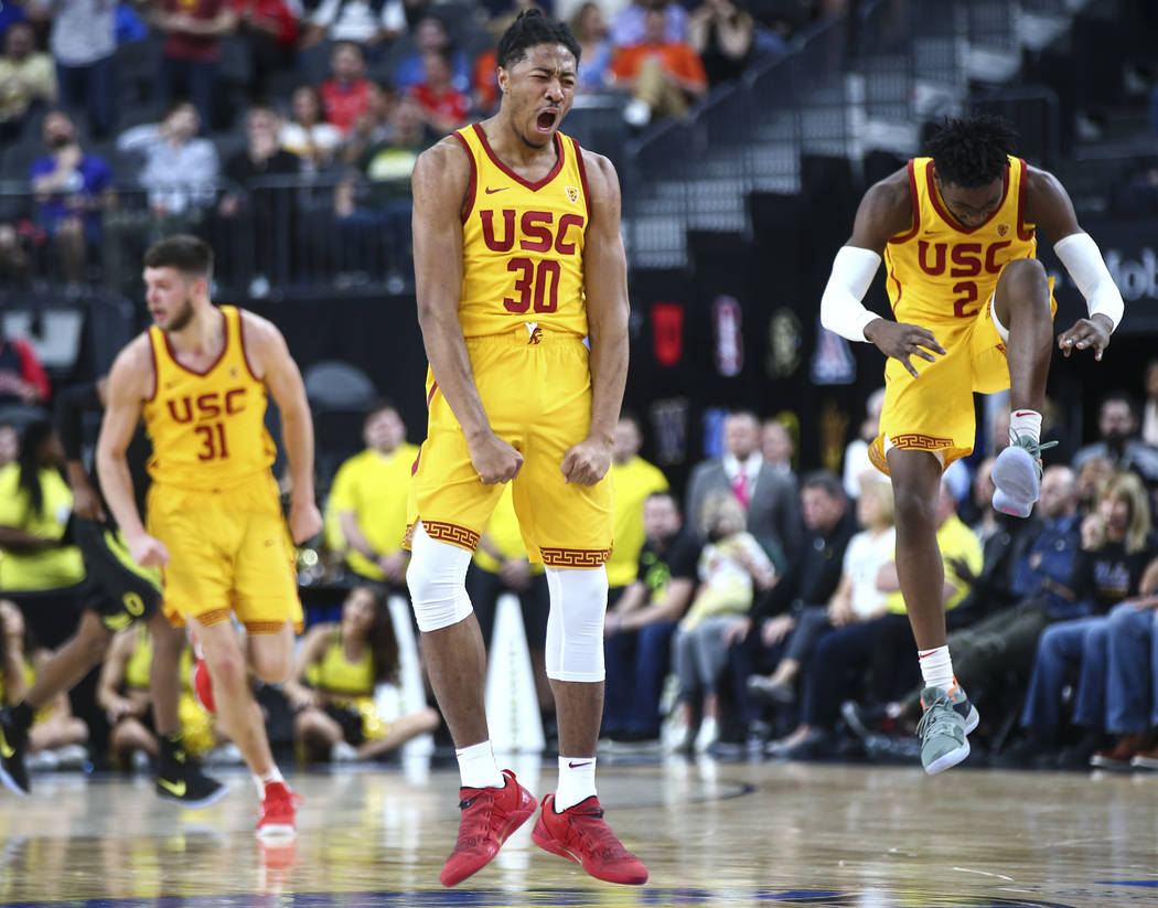 USC Trojans guard Elijah Stewart (30) celebrates after he scored against the Oregon Ducks during the first half of a semifinal basketball game in the Pac-12 basketball tournament at T-Mobile Arena in Las Vegas on Friday, March 9, 2018. Chase Stevens Las Vegas Review-Journal @csstevensphoto