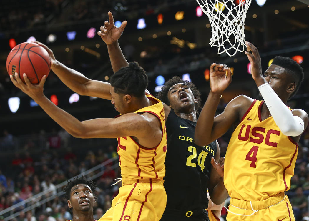 USC Trojans guard Elijah Stewart (30) gets a rebound against Oregon Ducks forward Abu Kigab (24) during the first half of a semifinal basketball game in the Pac-12 basketball tournament at T-Mobile Arena in Las Vegas on Friday, March 9, 2018. Chase Stevens Las Vegas Review-Journal @csstevensphoto