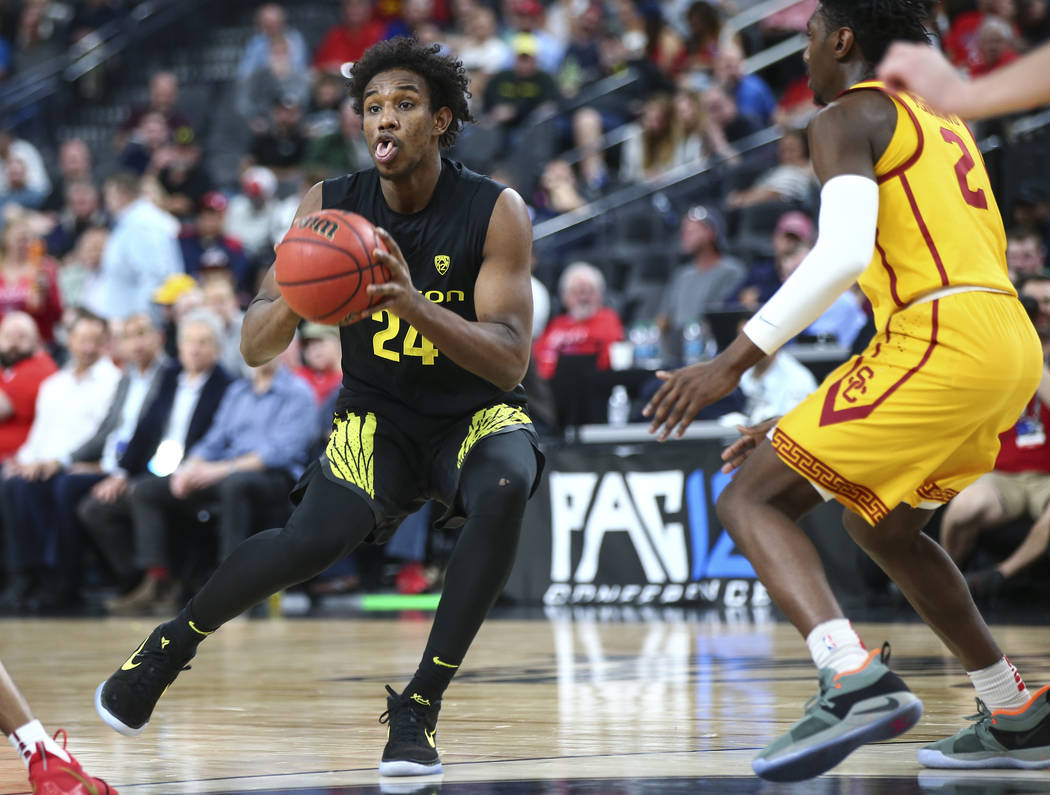 Oregon Ducks forward Abu Kigab (24) looks to pass as USC Trojans guard Jonah Mathews (2) defends during the first half of a semifinal basketball game in the Pac-12 basketball tournament at T-Mobile Arena in Las Vegas on Friday, March 9, 2018. Chase Stevens Las Vegas Review-Journal @csstevensphoto