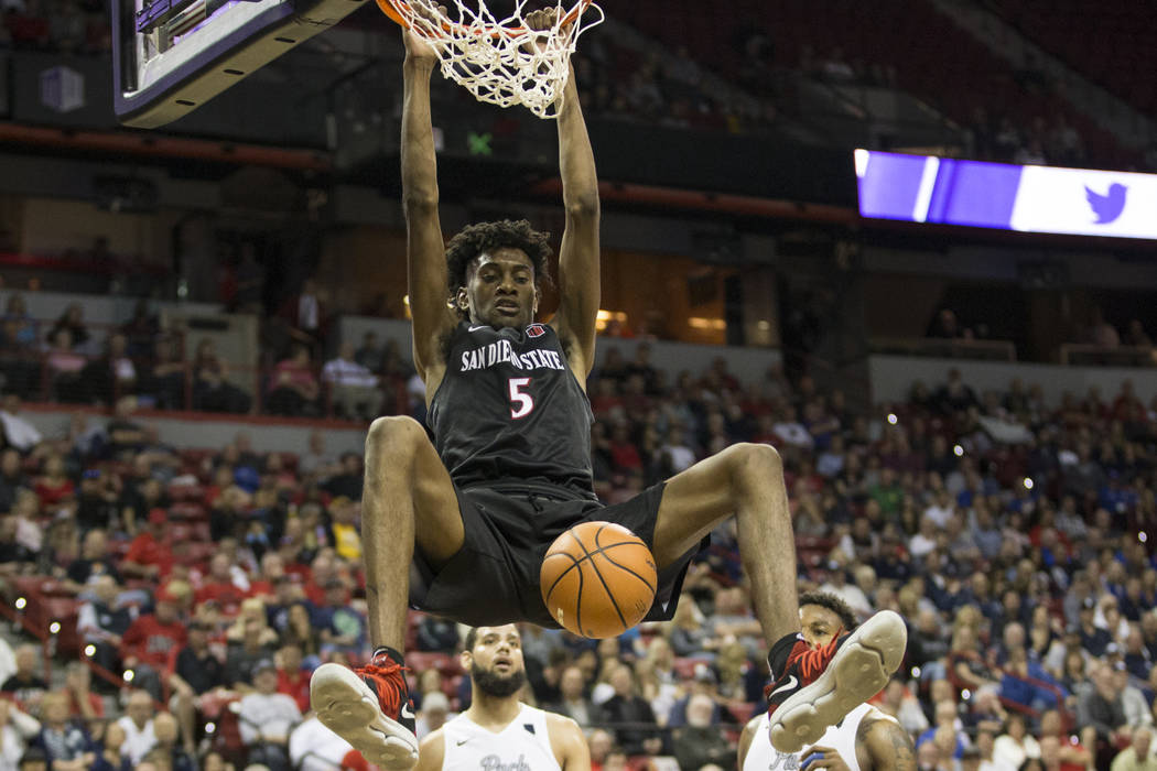 San Diego State Aztecs forward Jalen McDaniels (5) dunks the ball as Nevada Wolf Pack forward Caleb Martin (10) and guard Jordan Caroline (24) look on in the second half of the Mountain West Conference men's basketball tournament semifinal game at the Thomas & Mack Center in Las Vegas, Friday, March 9, 2018. San Diego won 90-73. Erik Verduzco Las Vegas Review-Journal @Erik_Verduzco
