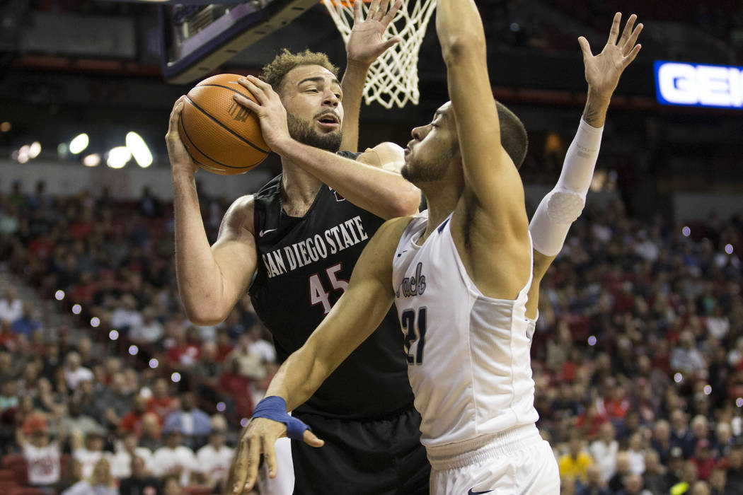 San Diego State Aztecs center Kameron Rooks (45) looks for an open pass against Nevada Wolf Pack guard Kendall Stephens (21) in the first half of the Mountain West Conference men's basketball tournament semifinal game at the Thomas & Mack Center in Las Vegas, Friday, March 9, 2018. Erik Verduzco Las Vegas Review-Journal @Erik_Verduzco