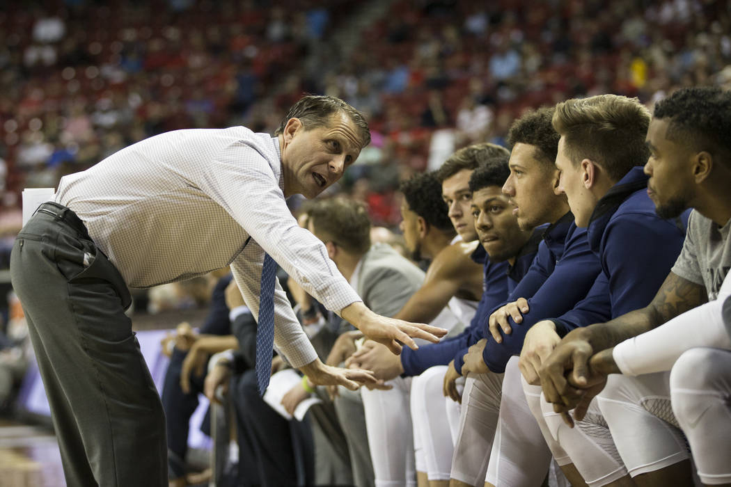 Nevada Wolf Pack head coach Eric Musselman talks to players on his bench in the first half of the Mountain West Conference men's basketball tournament semifinal game against San Diego State Aztecs at the Thomas & Mack Center in Las Vegas, Friday, March 9, 2018. Erik Verduzco Las Vegas Review-Journal @Erik_Verduzco