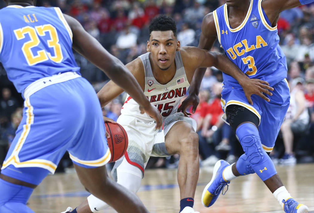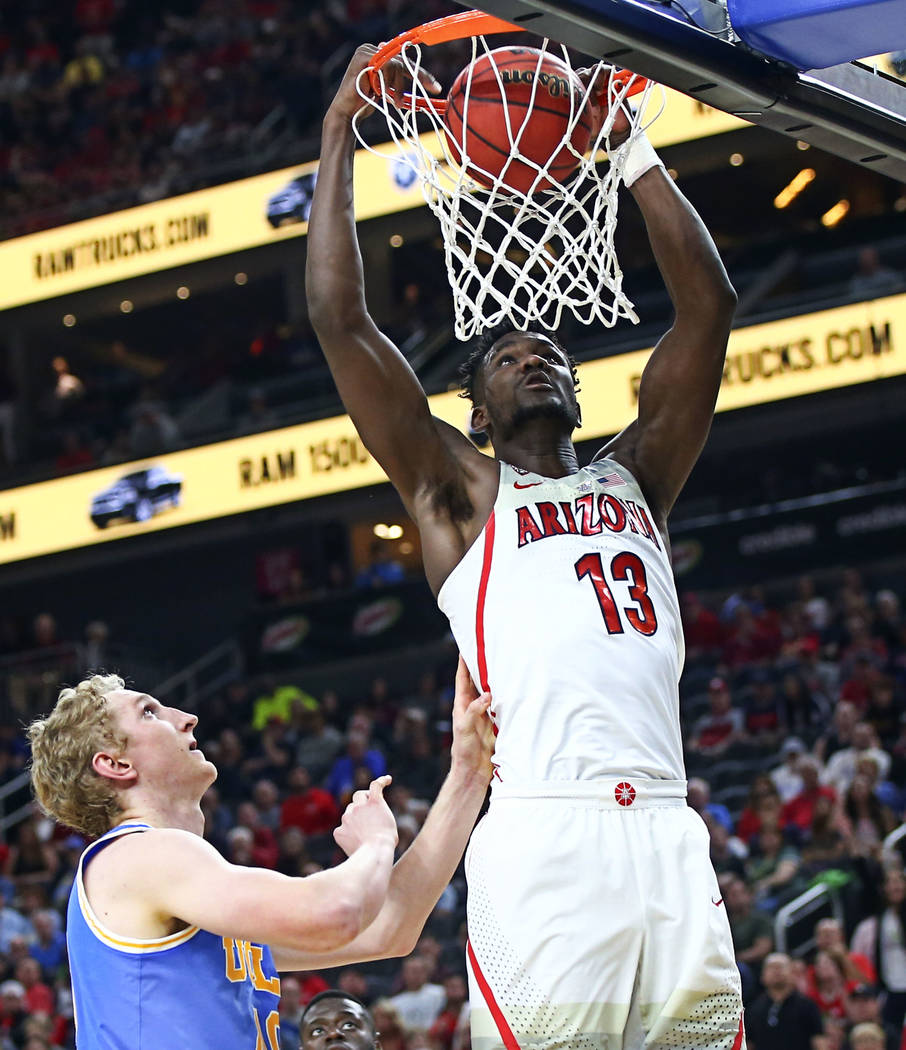 Arizona Wildcats forward Deandre Ayton (13) gets a rebound against UCLA Bruins guard Kris Wilkes (13) during the second half of a semifinal basketball game in the Pac-12 basketball tournament at T-Mobile Arena in Las Vegas on Friday, March 9, 2018. Chase Stevens Las Vegas Review-Journal @csstevensphoto