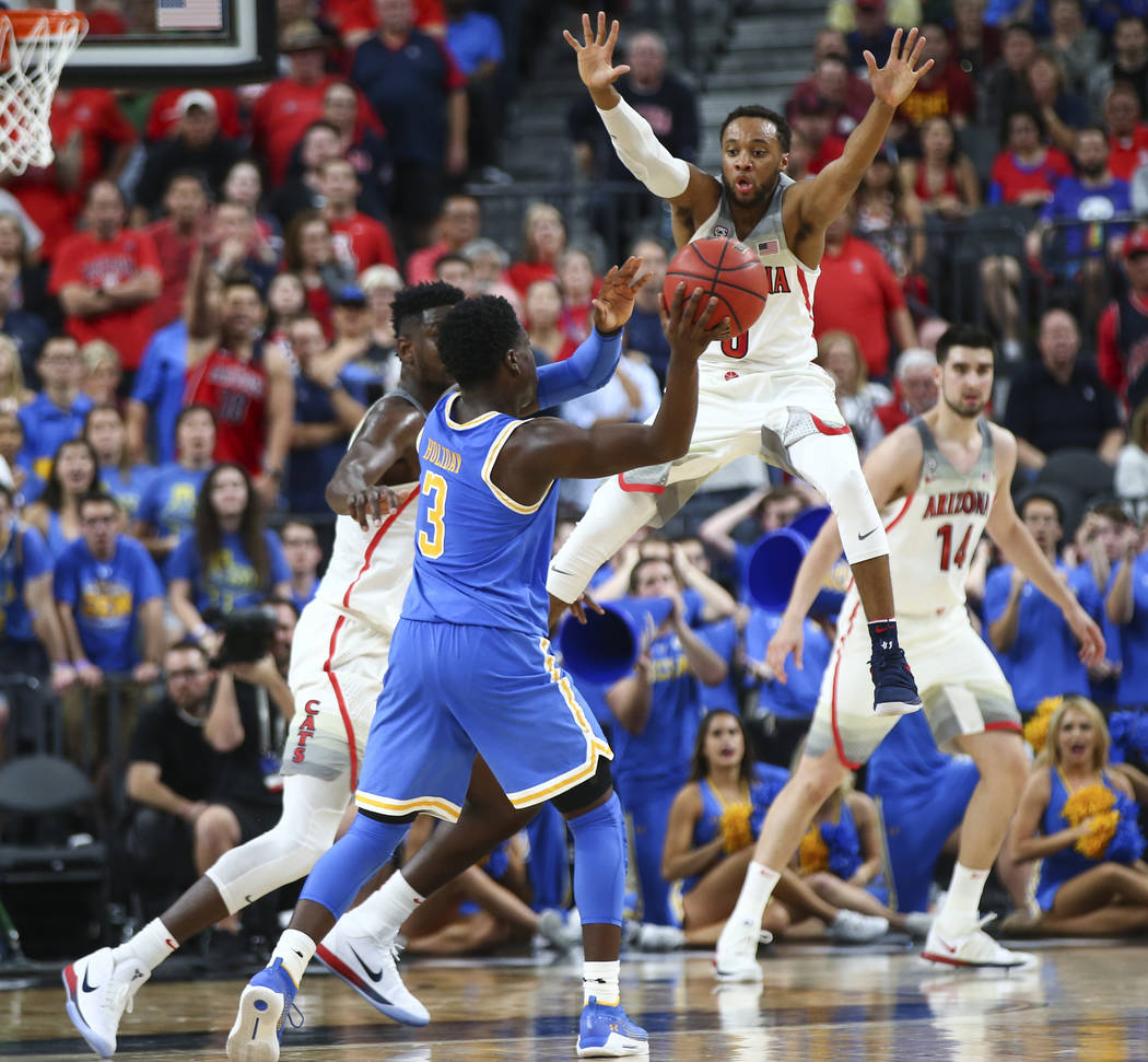 UCLA Bruins guard Aaron Holiday (3) looks to pass the ball as Arizona Wildcats guard Parker Jackson-Cartwright, upper right, defends during overtime in a semifinal basketball game in the Pac-12 basketball tournament at T-Mobile Arena in Las Vegas on Friday, March 9, 2018. Chase Stevens Las Vegas Review-Journal @csstevensphoto