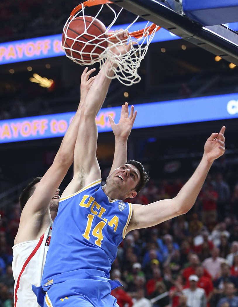 UCLA Bruins forward Gyorgy Goloman (14) dunks in front of Arizona Wildcats center Dusan Ristic during the first half of a semifinal basketball game in the Pac-12 basketball tournament at T-Mobile Arena in Las Vegas on Friday, March 9, 2018. Chase Stevens Las Vegas Review-Journal @csstevensphoto