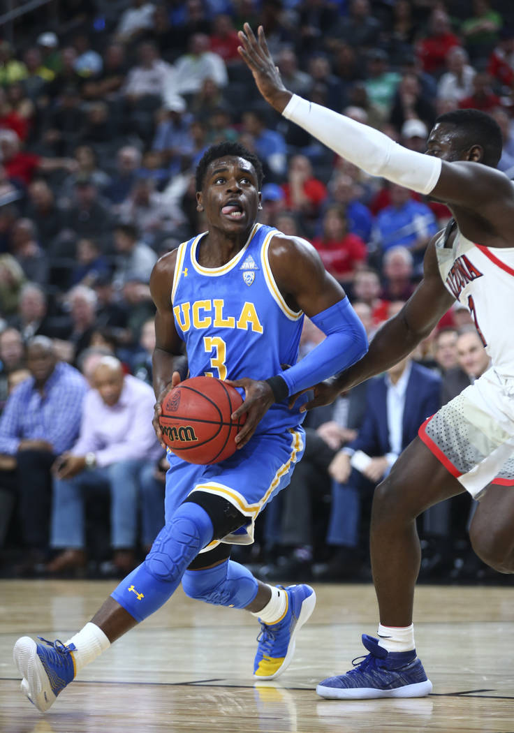 UCLA Bruins guard Aaron Holiday (3) drives past Arizona Wildcats guard Rawle Alkins (1) during the first half of a semifinal basketball game in the Pac-12 basketball tournament at T-Mobile Arena in Las Vegas on Friday, March 9, 2018. Chase Stevens Las Vegas Review-Journal @csstevensphoto