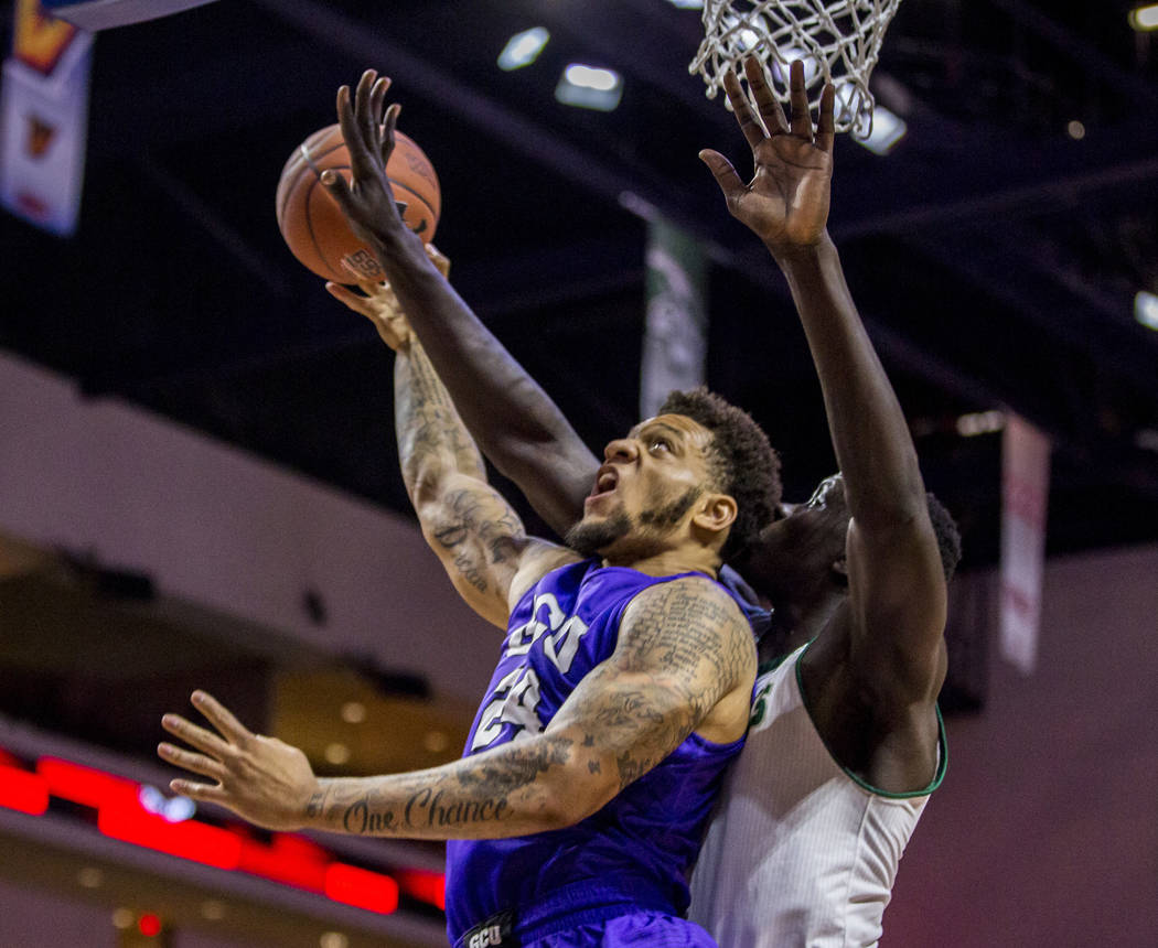 Grand Canyon Antelopes forward Keonta Vernon (24) goes up for a shot while Utah Valley Wolverines center Akolda Manyang (0) tries to block him during the first half a WAC semifinal game at the Orleans Arena in Las Vegas on Friday, March 9, 2018. Grand Canyon won 75-60. Patrick Connolly Las Vegas Review-Journal @PConnPie