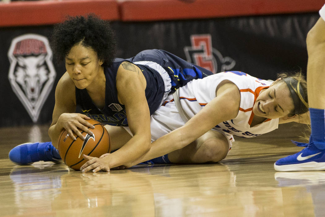 Nevada Wolf Pack guard Camariah King (24) dives for the ball over Boise State Broncos guard Braydey Hodgins (14) in the first quarter of the Mountain West Conference women's basketball tournament championship game at the Thomas & Mack Center in Las Vegas, Friday, March 9, 2018. Erik Verduzco Las Vegas Review-Journal @Erik_Verduzco