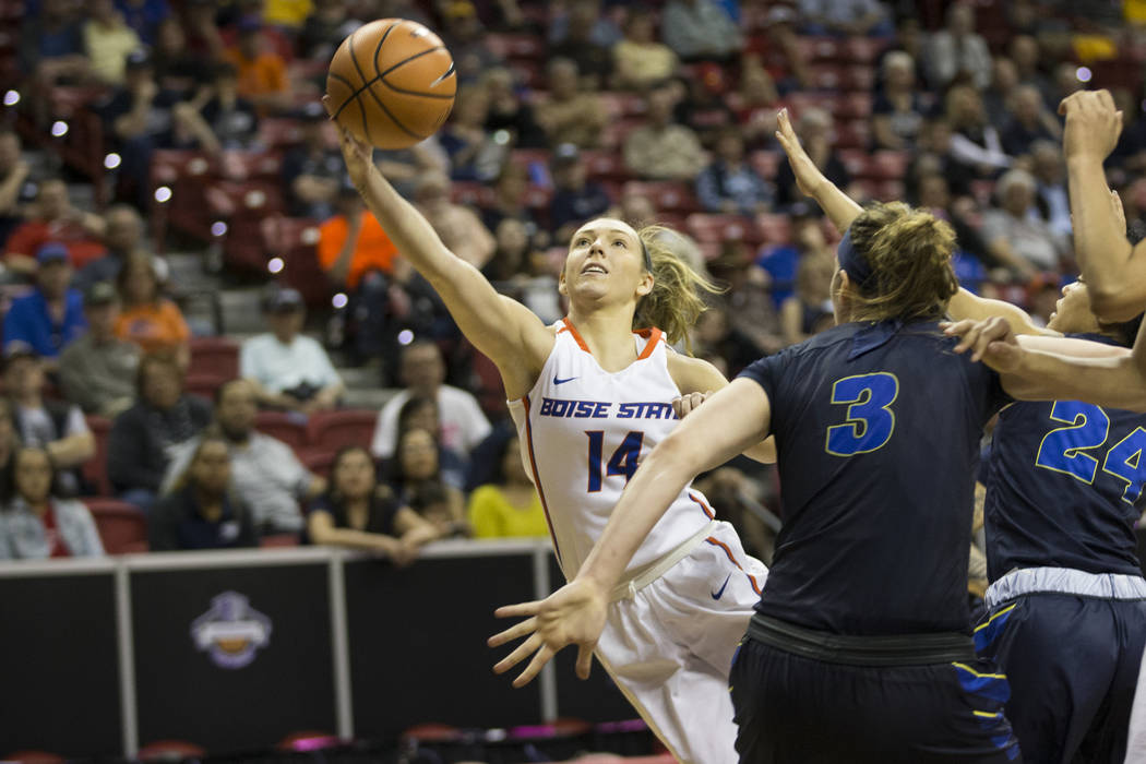 Boise State Broncos guard Braydey Hodgins (14) shoots the ball against Nevada Wolf Pack in the third quarter of the Mountain West Conference women's basketball tournament championship game at the Thomas & Mack Center in Las Vegas, Friday, March 9, 2018. Boise State won 62-60. Erik Verduzco Las Vegas Review-Journal @Erik_Verduzco