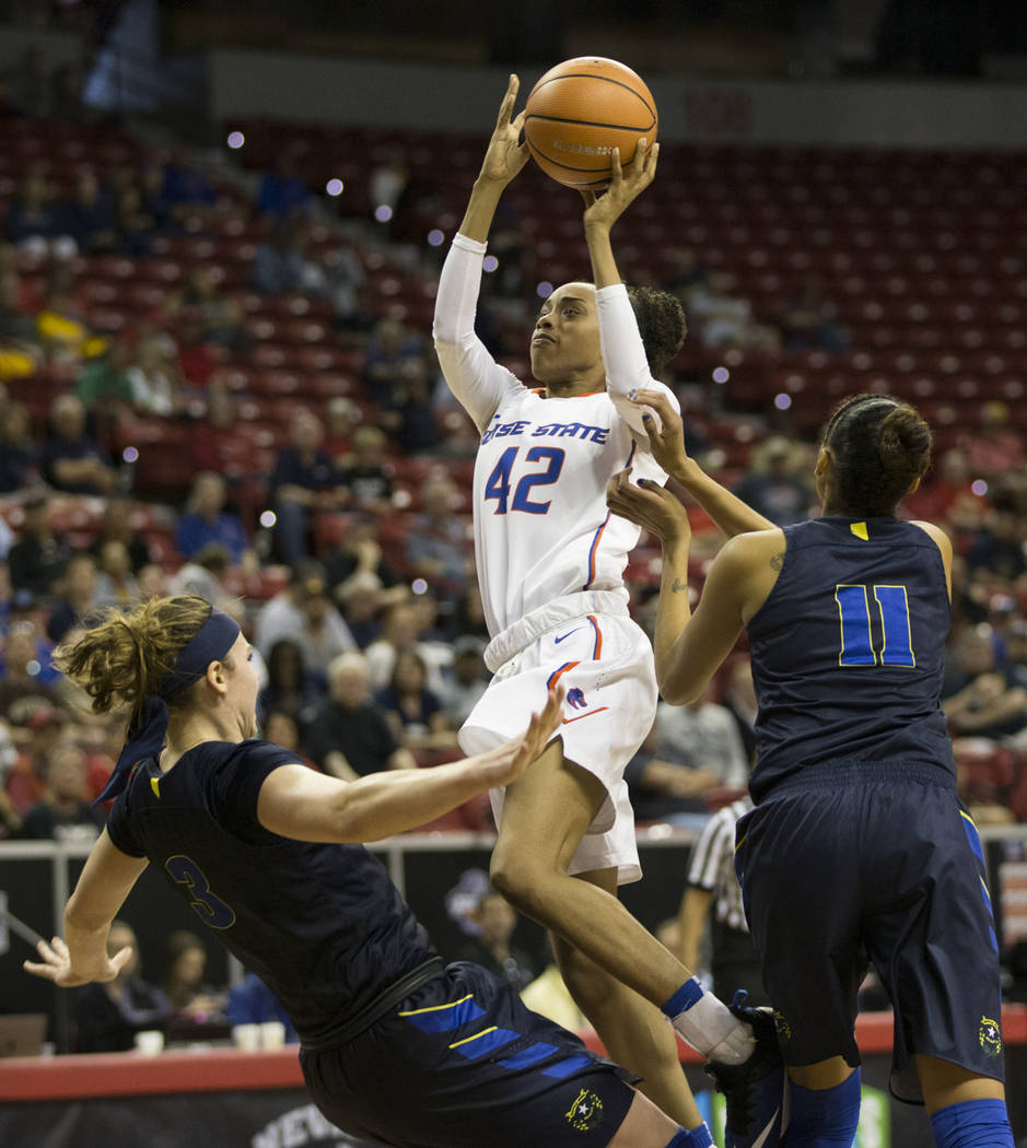 Boise State Broncos forward A'Shanti Coleman (42) shoots the ball against Nevada Wolf Pack forward Teige Zeller (3) before getting called for a charge in the fourth quarter of the Mountain West Conference women's basketball tournament championship game at the Thomas & Mack Center in Las Vegas, Friday, March 9, 2018. Boise State won 62-60. Erik Verduzco Las Vegas Review-Journal @Erik_Verduzco
