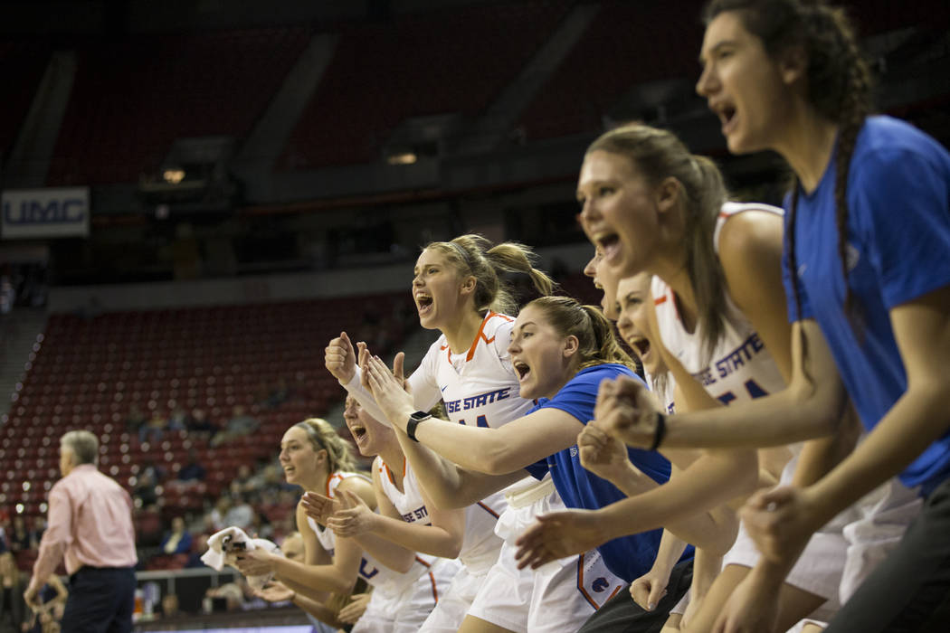 The Boise State Broncos bench reacts to a play against Nevada Wolf Pack in the fourth quarter of the Mountain West Conference women's basketball tournament championship game at the Thomas & Mack Center in Las Vegas, Friday, March 9, 2018. Boise State won 62-60. Erik Verduzco Las Vegas Review-Journal @Erik_Verduzco