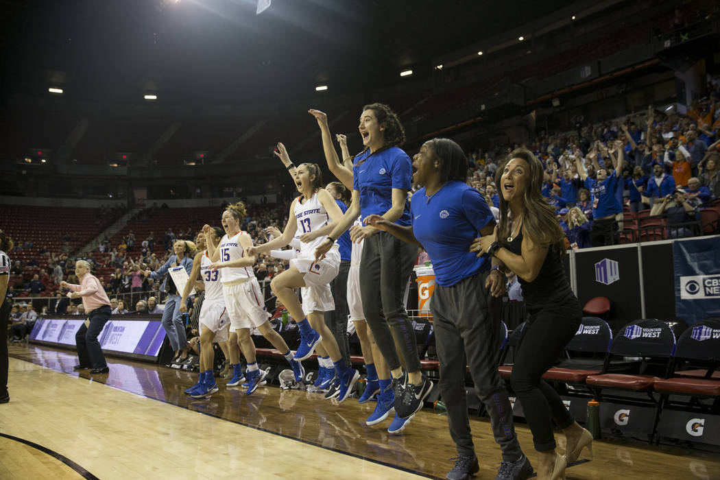 The Boise State Broncos bench react to a score in the last second of the game to win against Nevada Wolf Pack in the Mountain West Conference women's basketball tournament championship game at the Thomas & Mack Center in Las Vegas, Friday, March 9, 2018. Boise State won 62-60. Erik Verduzco Las Vegas Review-Journal @Erik_Verduzco