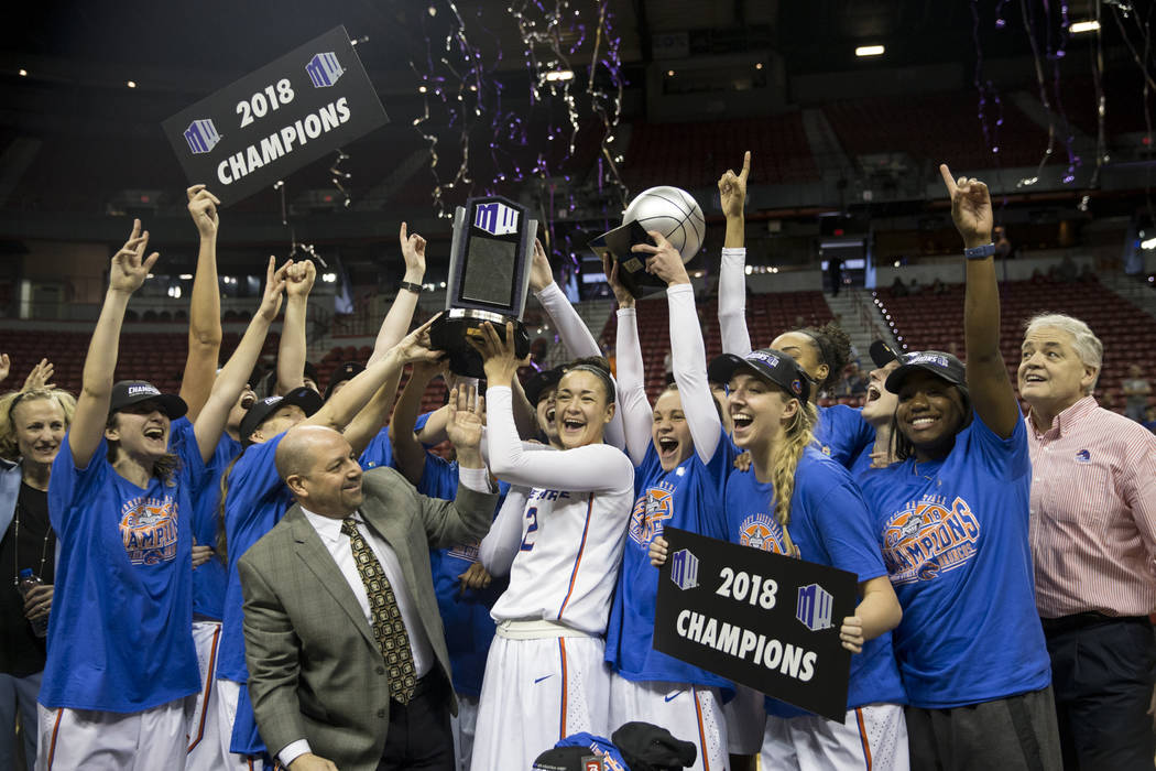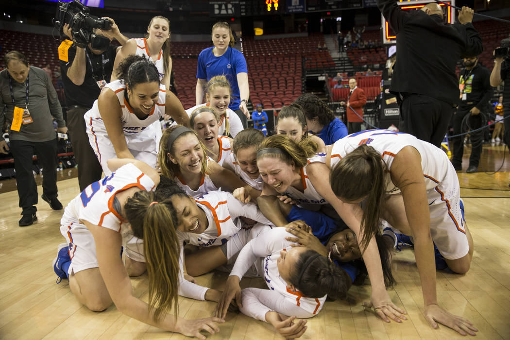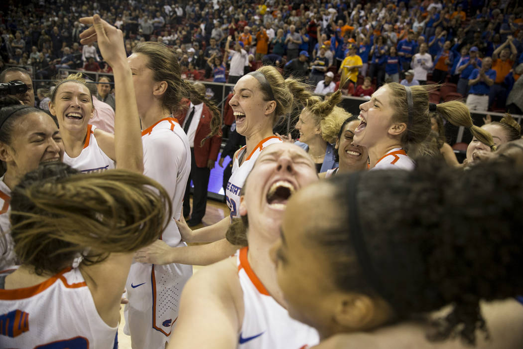 Boise State Broncos players celebrate their win against Nevada Wolf Pack in the Mountain West Conference women's basketball tournament championship game at the Thomas & Mack Center in Las Vegas, Friday, March 9, 2018. Boise State won 62-60. Erik Verduzco Las Vegas Review-Journal @Erik_Verduzco