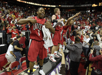 Despite a determined effort by arena security guards, fans flooded the court after the final buzzer and mobbed UNLV’s players in a wild celebration.